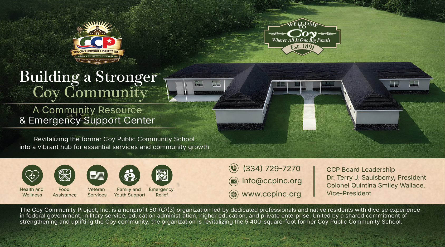 The mission of the Coy AL Community Project, Inc. is to enhance the quality of life and restore hope for all residents of the Coy area, regardless of age or ability. We strive to achieve this by developing a community center that provides essential resources and services—including emergency and disaster relief, as well as support for seniors, veterans, and families.