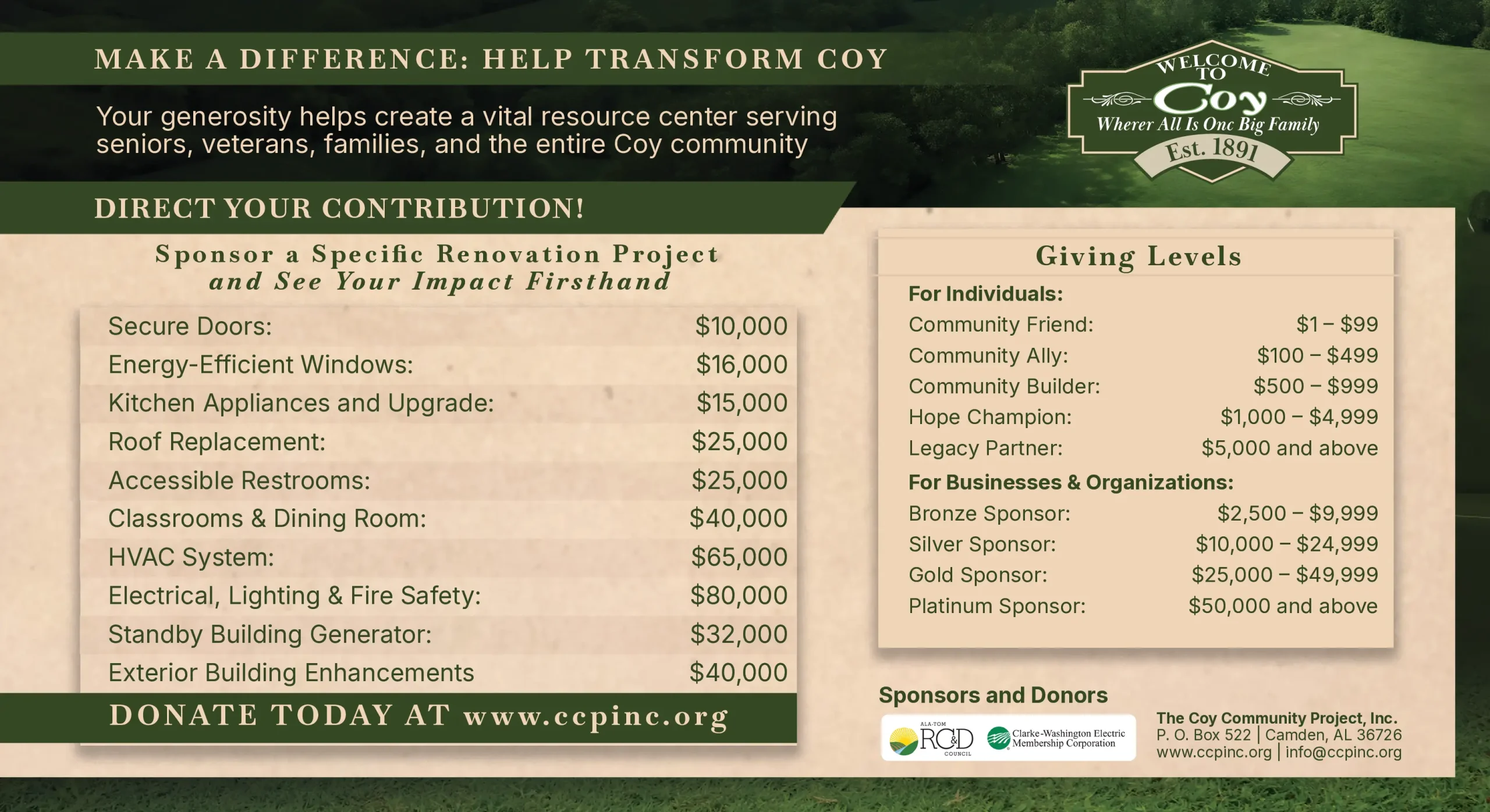 Your generosity can directly improve lives in Coy, Alabama. By sponsoring a renovation project or making a donation, you'll help establish a vital resource center serving seniors, veterans, families, and all residents.